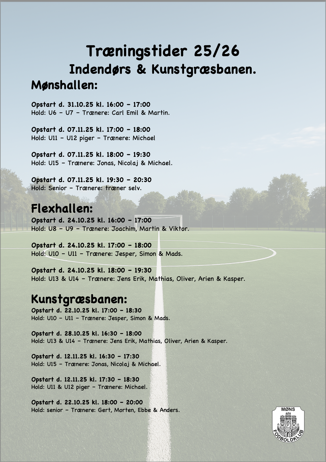 Træningstider 25/26 - Indendørs & kunstgræsbanen.